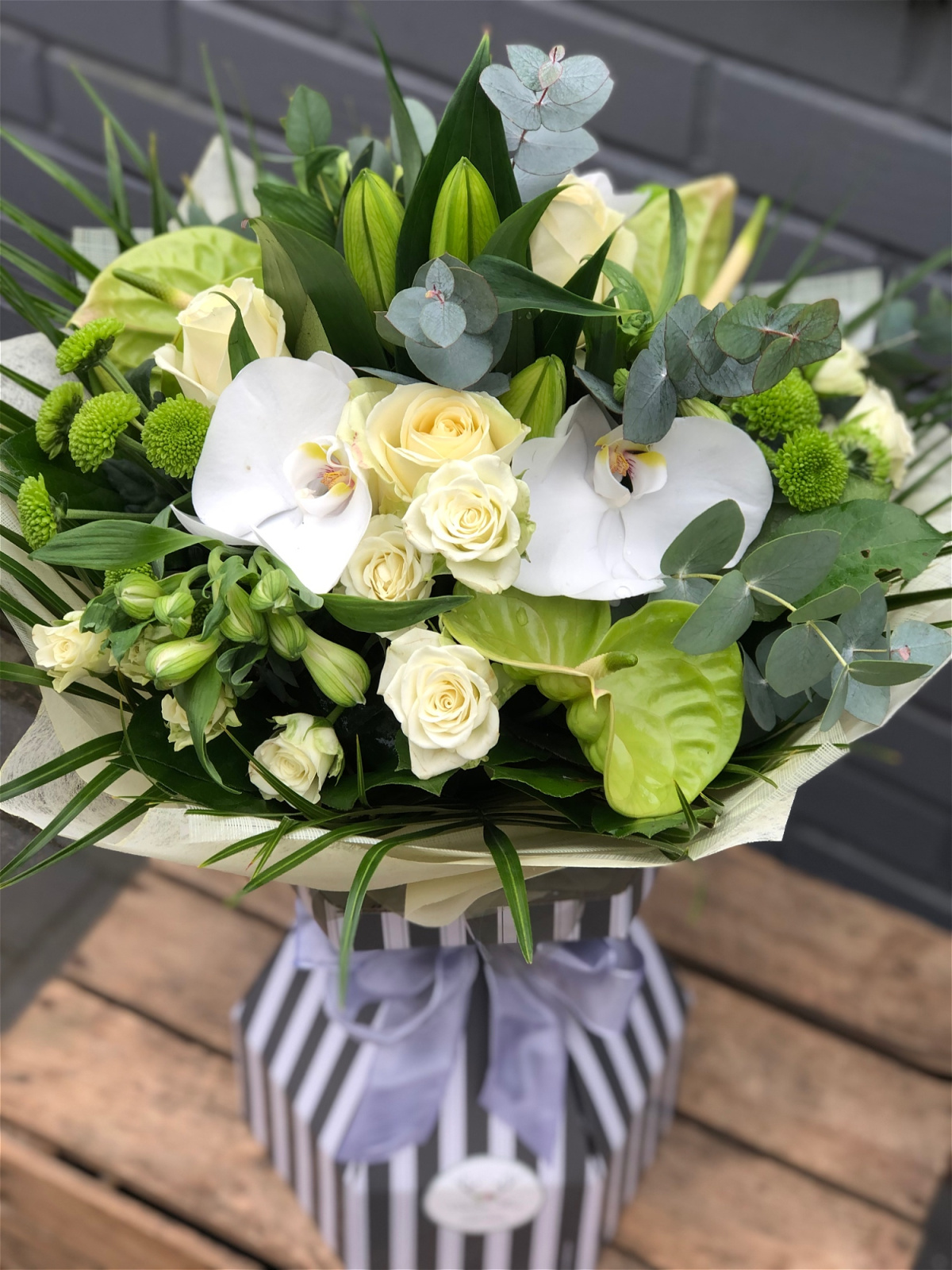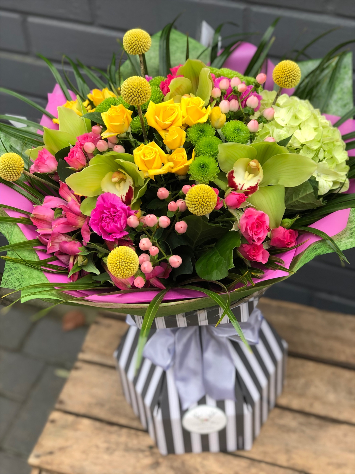 A florist choice stunning mixed flower bouquet containing beautiful fresh seasonal flowers. Perfectly placed in our signature striped gift box. This bouquet will be created in line with the days freshest flower delivery in colours chosen by our in house florist Rebecca.