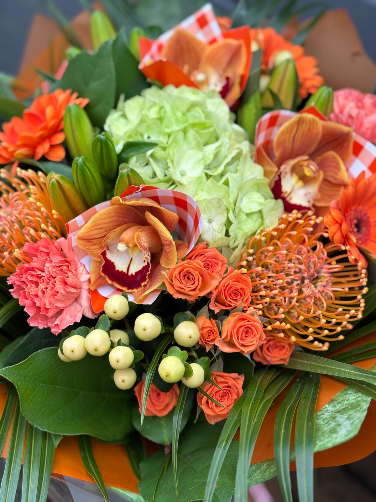 Layers of juicy orange blooms, fresh greens and playful gingham details make this bouquet feel like a little jar of sunshine for Mother’s Day.