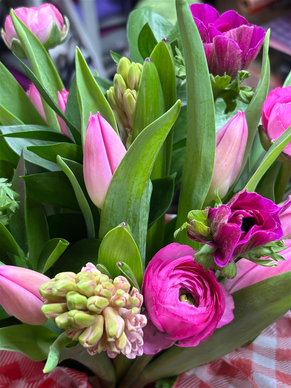 Blushing tulips, ruffled ranunculus and hyacinth buds wrapped in our signature gingham — like a jar of something lovingly made, just for her.