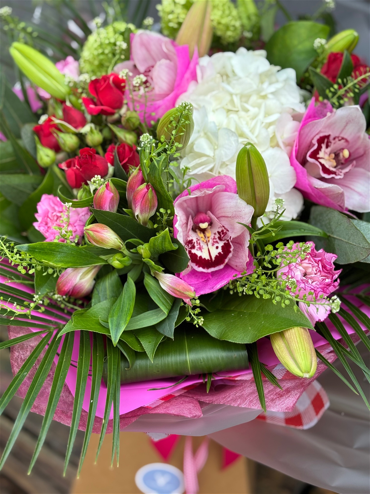 Lush hydrangea, delicate orchids and seasonal blooms are layered with fresh greens and finished with our signature ribbon detail — creating a bouquet that feels as joyful and thoughtful as Mum herself.