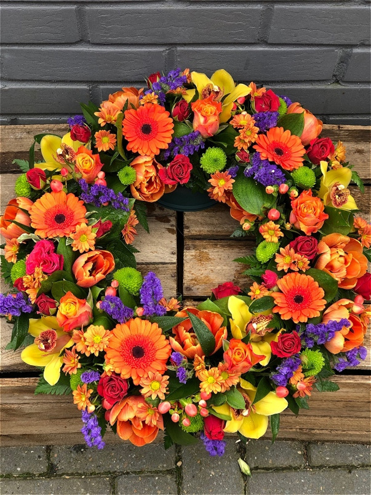 Stunning orange and purple seasonal blooms arranged in a traditional wreath style to create a beautiful funeral tribute.