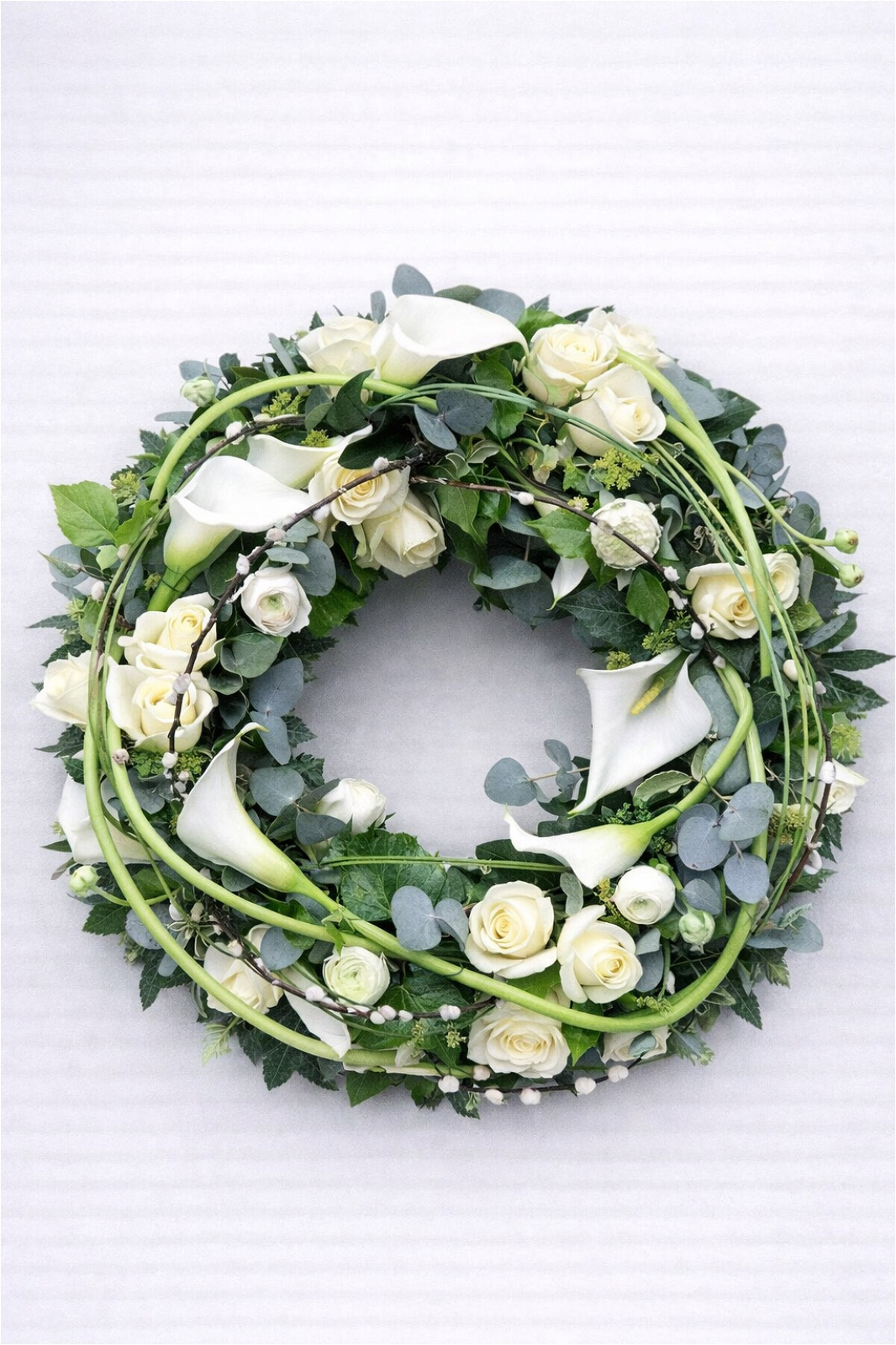 A modern twist to a traditional wreath. This wreath is based in all seasonal foliage's with clusters of Roses and looped Calla lilies. A gorgeous design certainly to make a heartfelt statement.