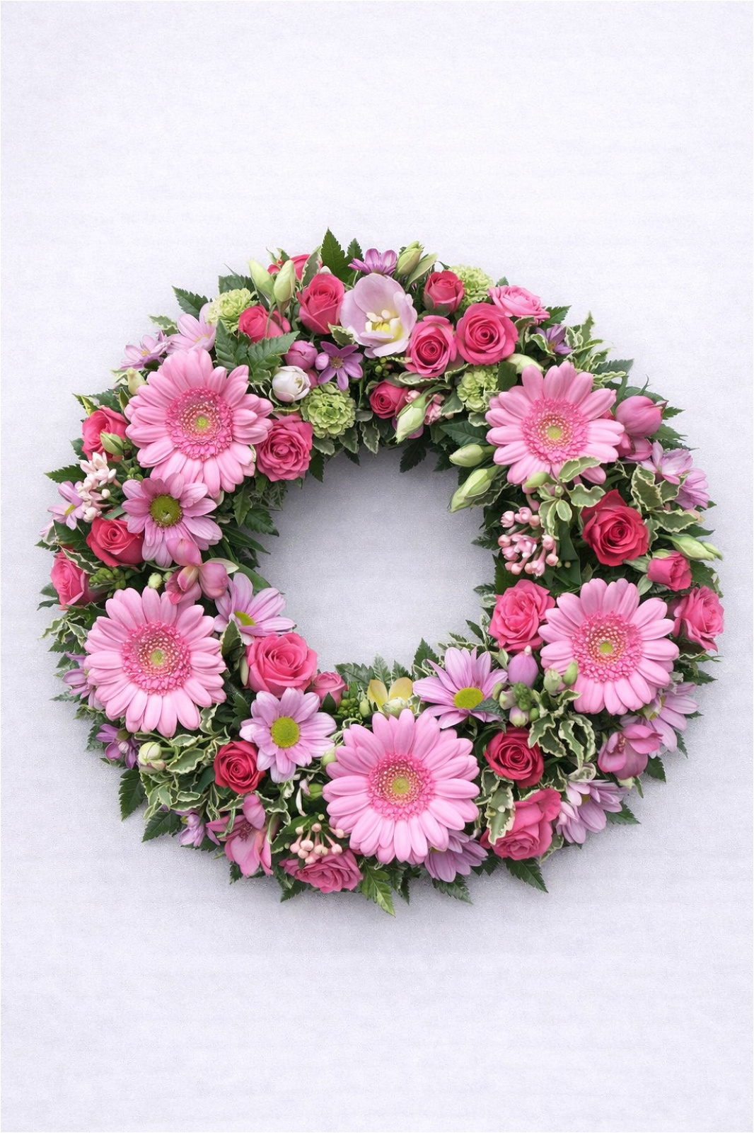 A beautiful wreath made with a selection of cerise pink roses and seasonal flowers, arranged in a traditional style to create a beautiful funeral tribute. The choice of flowers in this design are sure to include only the highest quality stems, used at their peak to ensure they are looking their very best for the occasion.