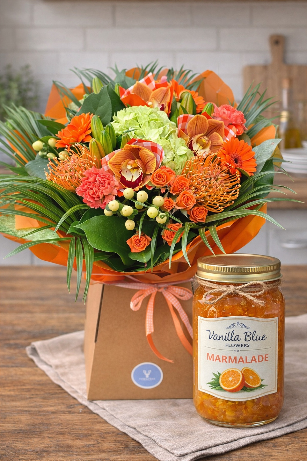 Layers of juicy orange blooms, fresh greens and playful gingham details make this bouquet feel like a little jar of sunshine for Mother’s Day.